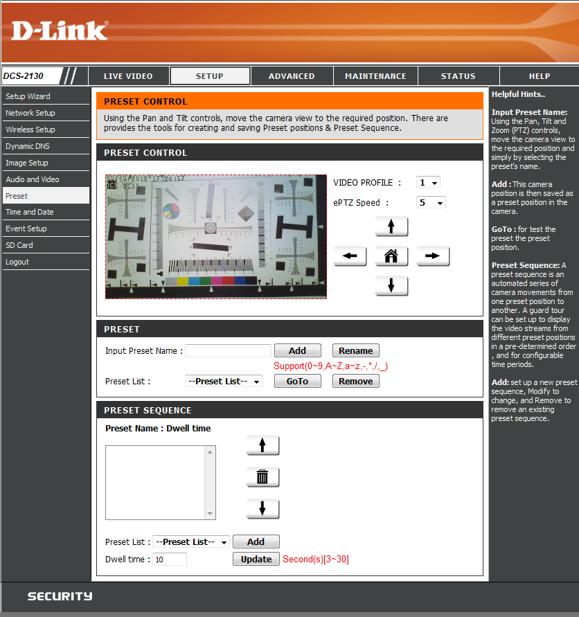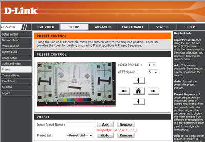 Несмотря на довольно низкое по сегодняшним меркам разрешение в 1280х800 пикселей, камера DCS-2103 имеет функции электронного зума и поворота, что позволяет ей работать как виртуальной PTZ камере. Можно задать несколько «пресетов» и перемещаться между ними одним кликом. Функция интересная, но более уместная в камерах высокого разрешения