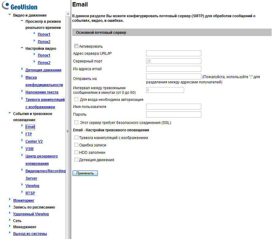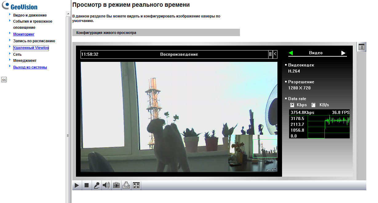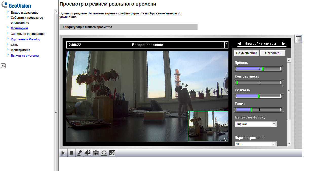 Начнем с камеры Geovison, а именно с меню просмотра живого видео и его настройки.
