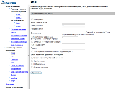Теперь перейдем к меню настройки реагирования на события. Тут оно реализовано несколько иначе чем у камеры Geovision: отдельно настраиваются «медиа» - то, что будет передаваться по событию, отдельно настраиваются события и, отдельно, как и куда будет отравляться медиа-файл.