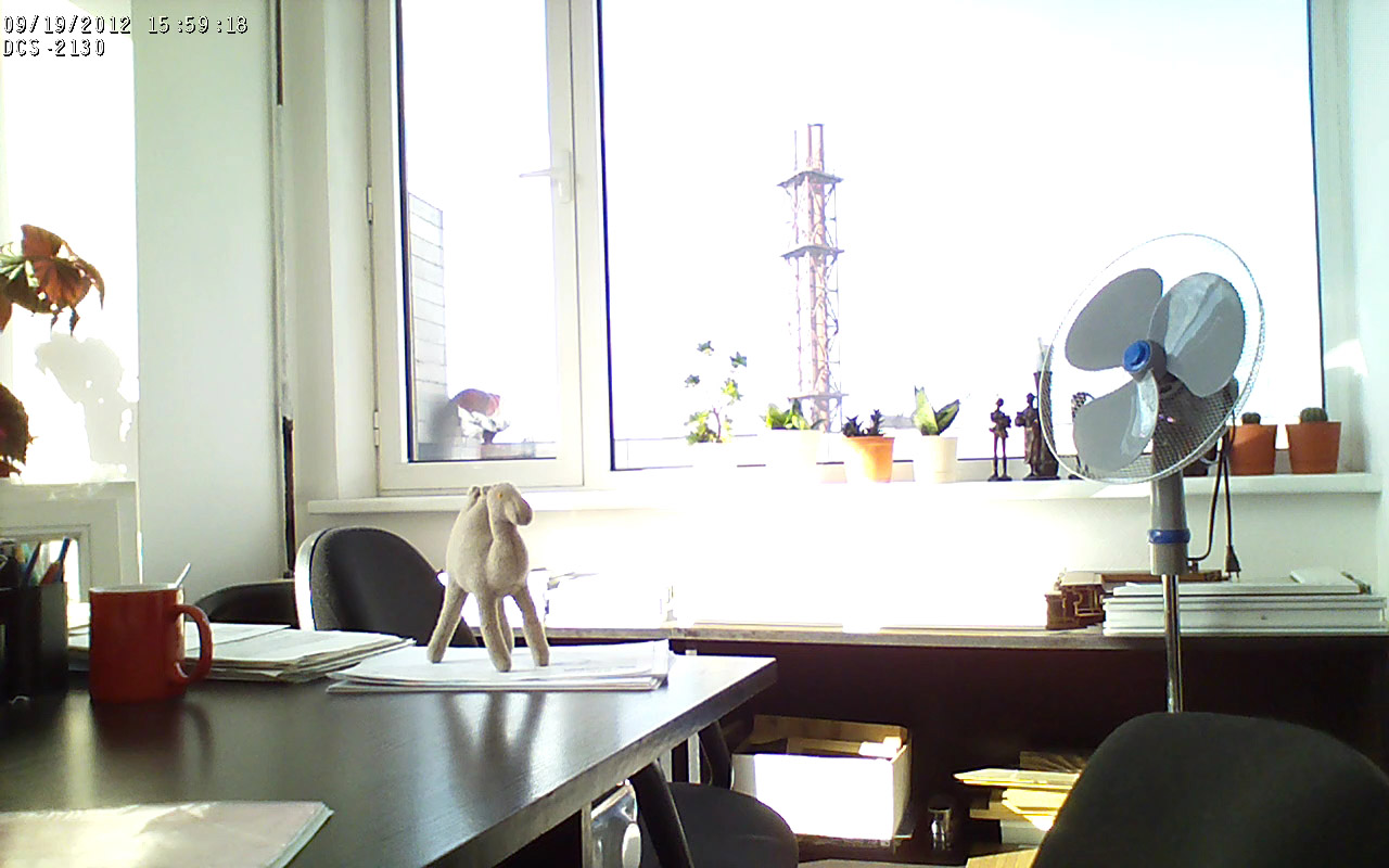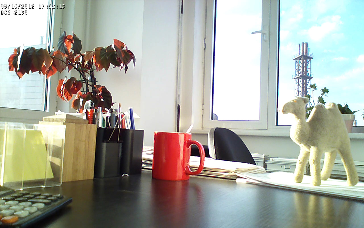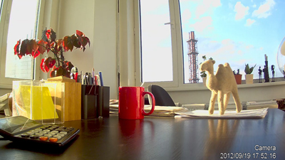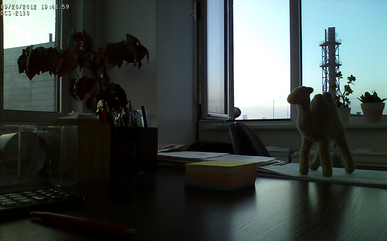 Мы специально расположили камеры напротив окна, чтобы оценить ширину динамического диапазона (способность одинаково хорошо отображать как темные, так и светлые участки). Картинка, выдаваемая камерой DCS-2103 более светлая, но передача деталей от этого страдает – многие светлые объекты на светлом фоне сливаются, равно как сливаются облака на фоне голубого неба. На картинке с GV-CB120 деталей ощутимо больше, хотя и наблюдается некоторая нехватка детализации в темных областях. В целом картинка темновата. Возможно это следствие использования тут менее светосильного объектива ( F2.4 против F2.0), возможно – реакция камеры на встречную засветку. Впрочем, для охранного видео важнее полнота деталей, а не субъективная «приятность» отображения.