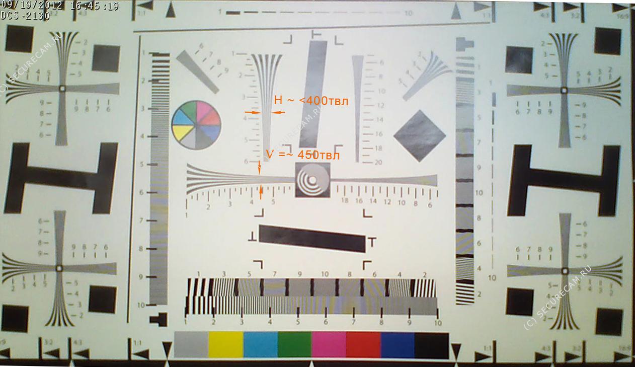 Для сравнения приведем результат аналогичного теста бюджетной профессиональной камеры ACTi TCM-4511 со штатным фиксированным объективом. Горизонтальное разрешение – порядка 800ТВЛ