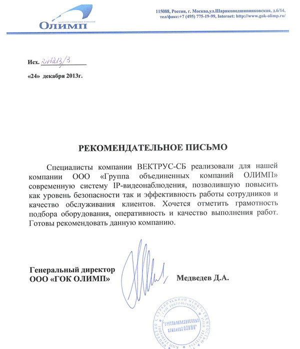 Специалисты компании ВЕКТРУС-СБ реализовали для нашей компании ООО «Группа объединенных компаний ОЛИМП современную систему IP-видеонаблюдения, позволившую повысить как уровень безопасности так и эффективность работы сотрудников и качество обслуживания клиентов. Хочется отметить грамотность подбора оборудования, оперативность и качество выполнения работ. Готовы рекомендовать данную компанию.